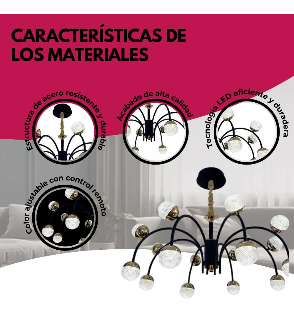 - Capacidad de Iluminación: Con capacidad para 16 focos, esta lámpara proporciona una iluminación brillante y efectiva, perfecta para ambientes interiores.
