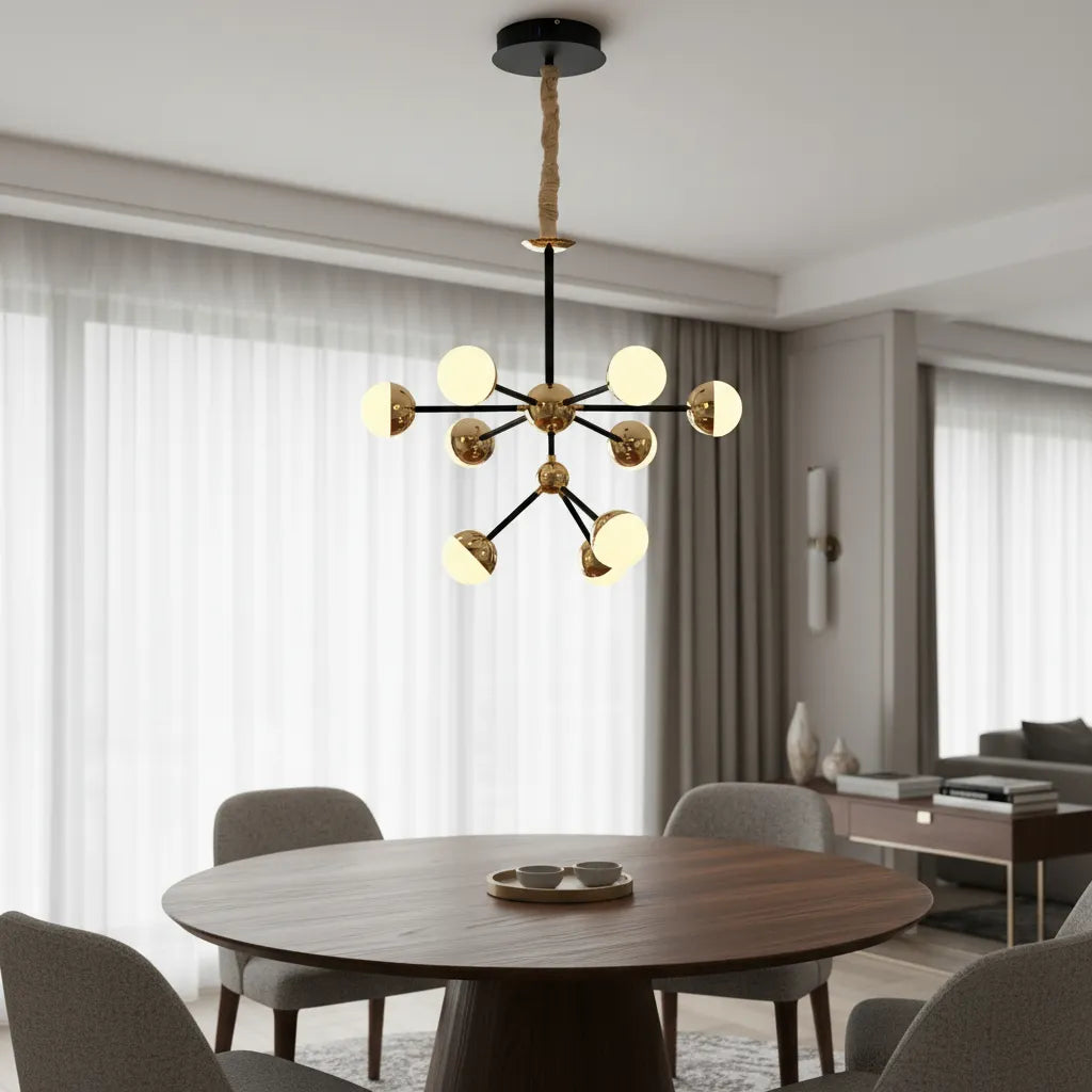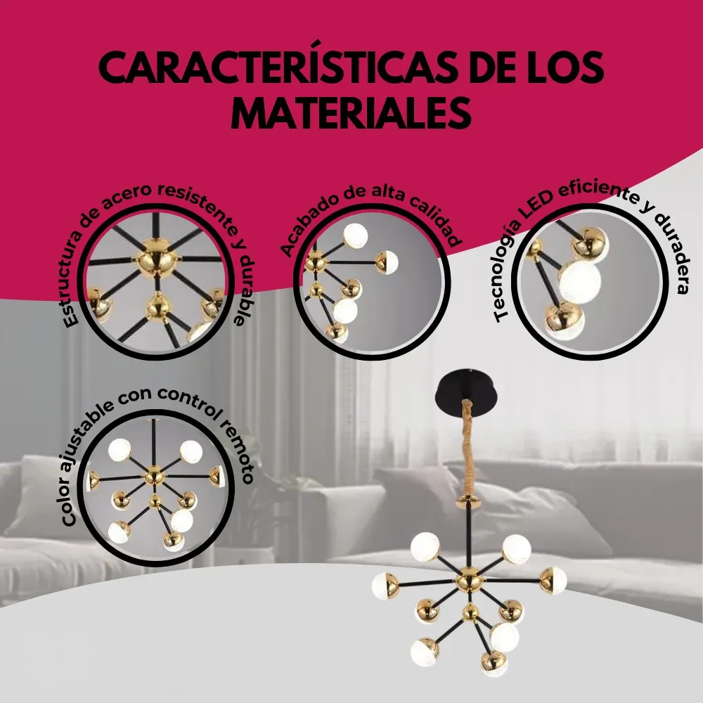 - Capacidad de Iluminación: Con capacidad para 9 focos, esta lámpara proporciona una iluminación brillante y efectiva, perfecta para ambientes interiores.