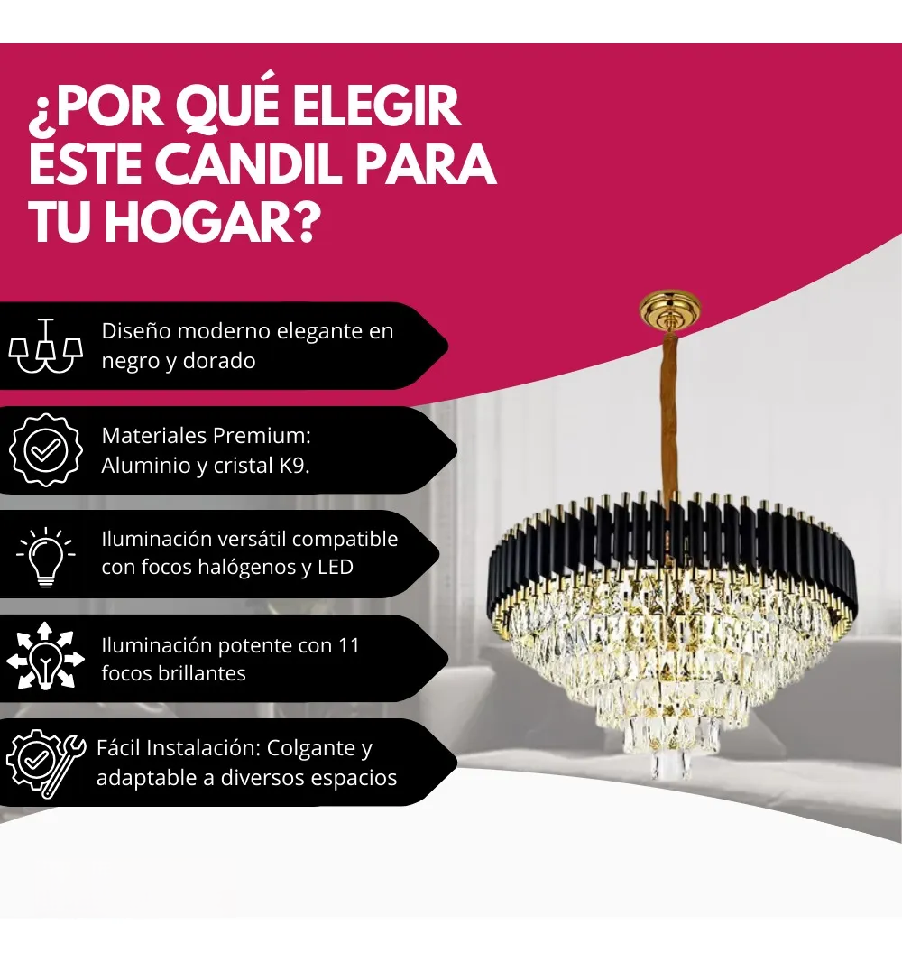 - Materiales de Alta Calidad: Fabricada con aluminio, acero y cristal K9, esta lámpara asegura durabilidad y una apariencia premium.